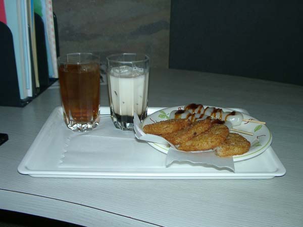 | ホテルの夜食です。 ここに映ってる飲み物t&食べ物(ハッシュポテトとみたらし団子)は 総てタダ!! 両方ともおいしかったですv(特にみたらし!) |