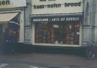 小さいから分かりづらいけどチーズ屋さんのショーウィンドー。 丸いチーズが色々並んでいる。 こっちの人は丸ごと一個とか買っていくのかな? |