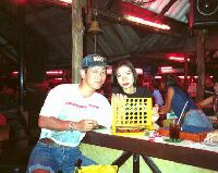 | その夜飲みに行ったムエタイバー。 真ん中にはリングがありムエタイが見られる。 知らないと写真のような五目並べを出され負けるとビールなどを買わされ痛い目に遭う。 こういうときは1バーツ位を掛けてやれば大した痛手にはならない。(シンガポールの彼に教わった) |