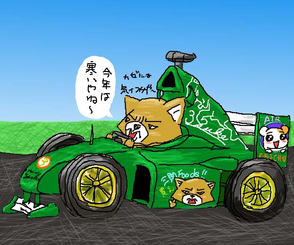 ふぅ、ホントに久しぶりの更新ですねぇ…3ヶ月ぶりくらいにここを更新したような?今回の絵ですが、誰が見ても一目瞭然、適当です!!製作時間は約1時間半〜2時間くらい(計ってない…)。線もフニャフニャだし、いつもの事ながら立体的に見ておかしいところ多数…それでも何だか許してしまいたくなるほど愛くるしい三助とエビちゅ。だからこんな絵でも許して〜(ダメ?)ちなみにカウルに描いてある白い動物の線は三助です。ジャガーのカラーリングを真似してます。F1観てる人なら分かると思うけど分からんだろうな… |