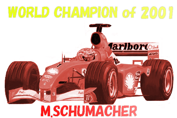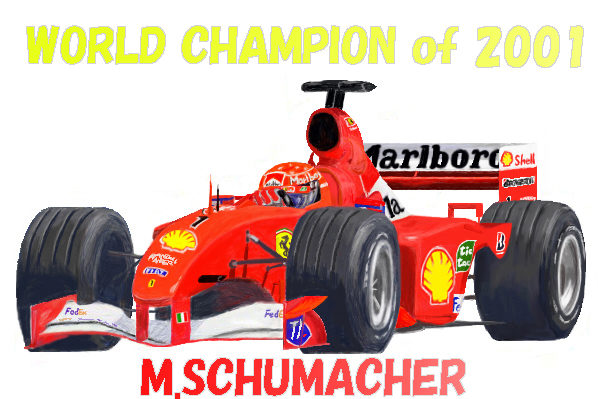 これはミハエル・シューマッハがチャンピオンを決めた時(結構時間経ってからだった気もするが…)に、記念として描いた絵です。何を描いたかというと、ただ文字を追加しただけですが…もっと気の利いた絵が描ければよかったんだけど、そうする事が出来ませんでした…来年はちゃんと描きたいなぁ |