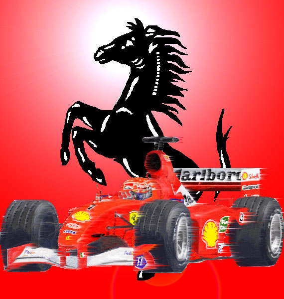 これは年賀状用に描いた"跳ね馬"のイラストとフェラーリの2001年型マシン、"F2001"をただ単に合成しただけのイラストです…手抜きにも程ってもんがあると思いますが、バックに跳ね馬を添えただけで、大分雰囲気が変わったのでいい感じに仕上がってるんじゃないかと思われます。手を抜いた割には結構お気に入りだったりするのである(笑) |