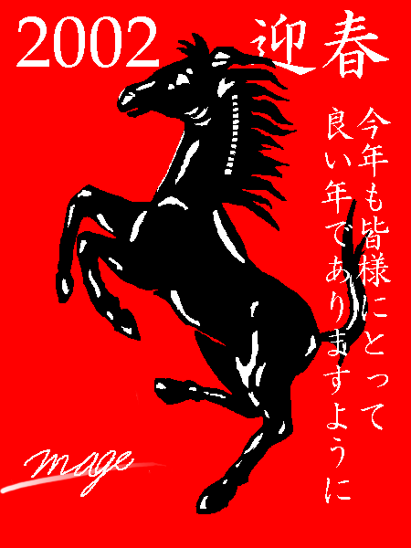 これは2002年の年賀状のイラストです。 誰かに送ったわけではなくHPに飾ってただけですが… ホントに随分長い間飾っておりました… シンプルだけど出来は気に入ってるので来年も使いまわすかな? |
